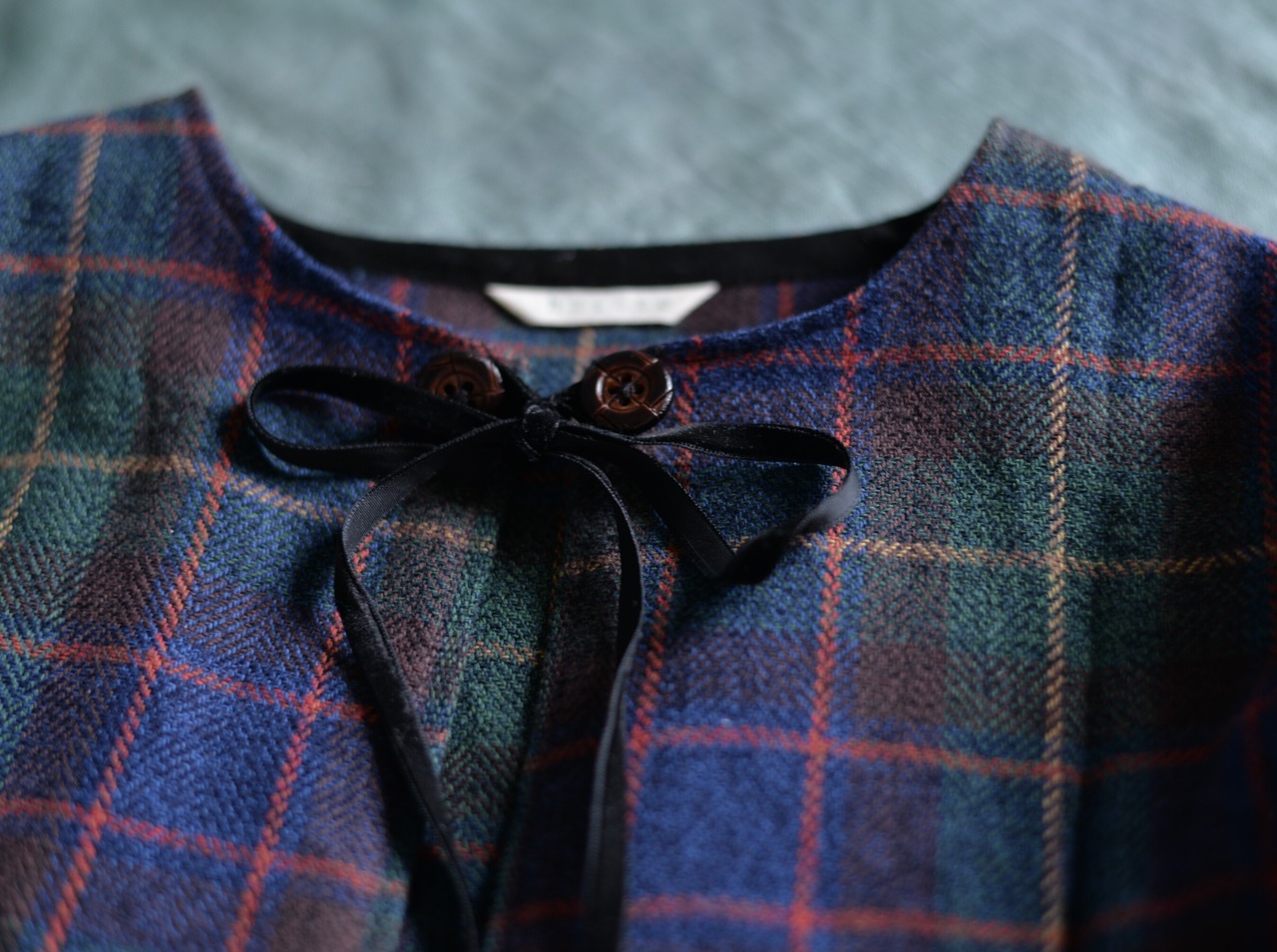 襟もとのリボンをボタンにかけて留めることができます。