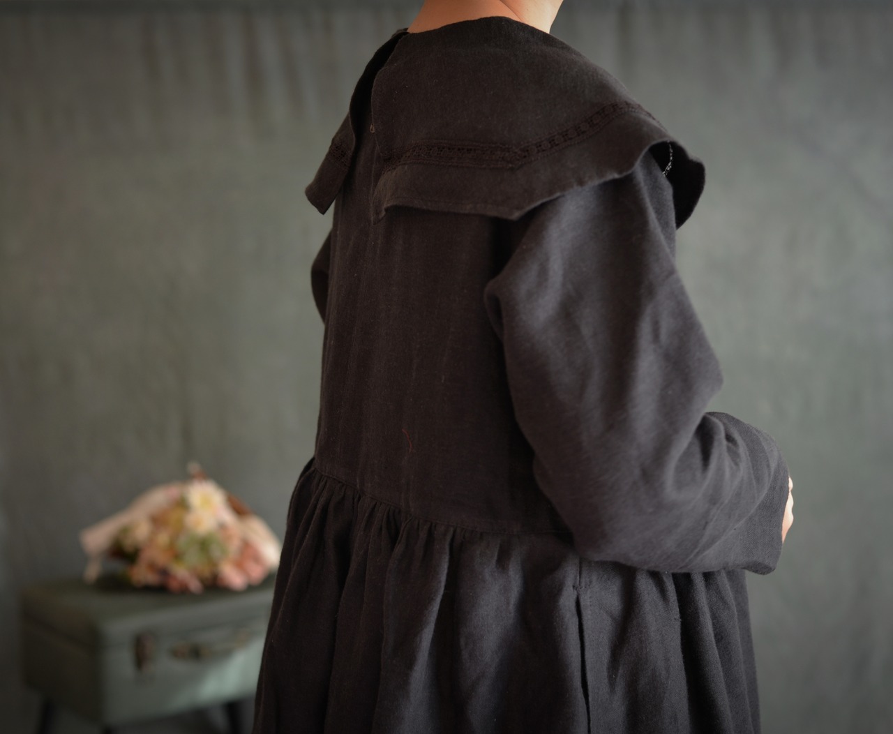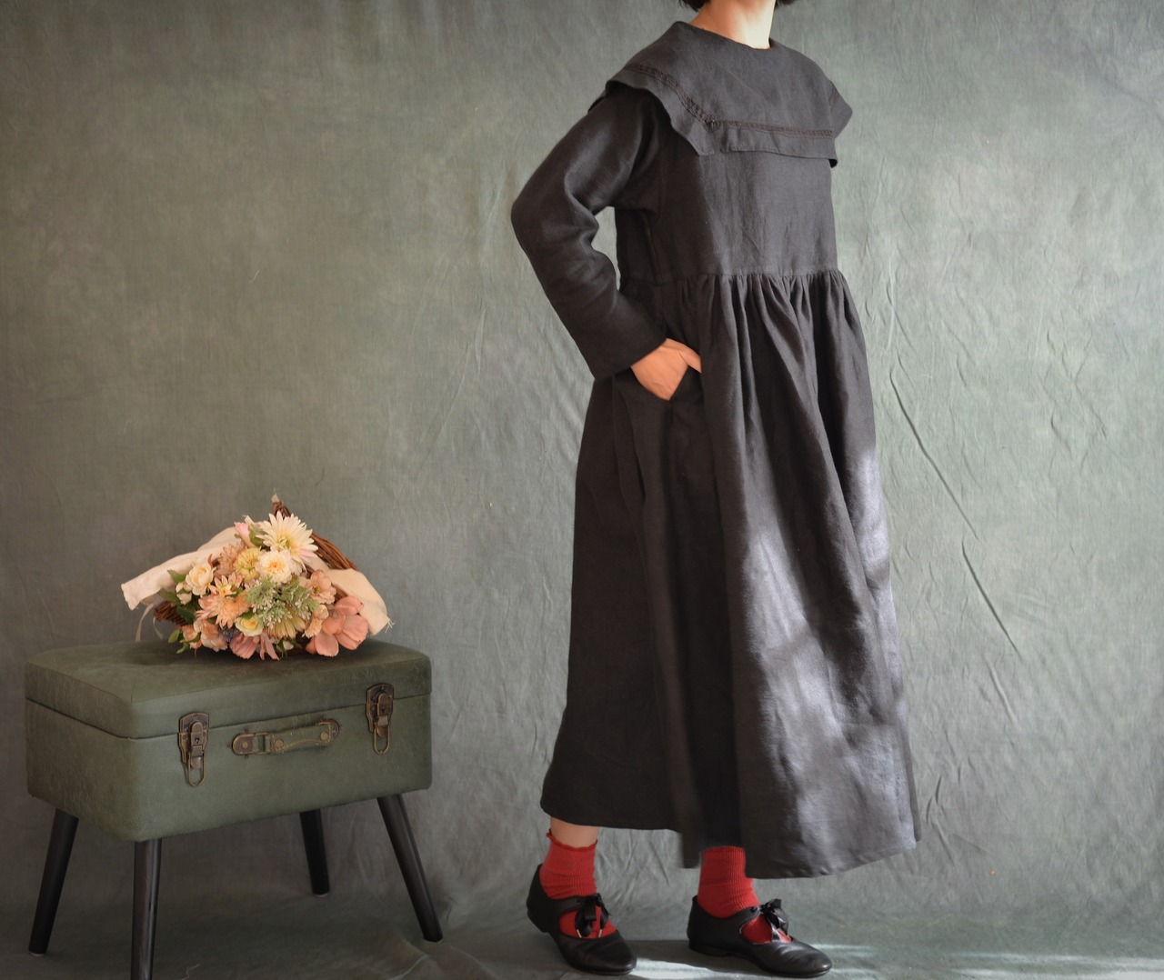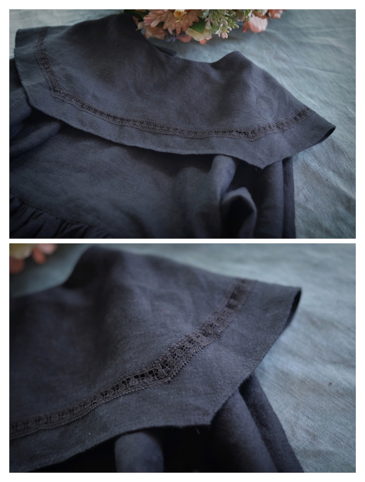 襟にはリバーレースを使用し、ふわふわとしたリネンとレースの透け感の対比をアクセントに。